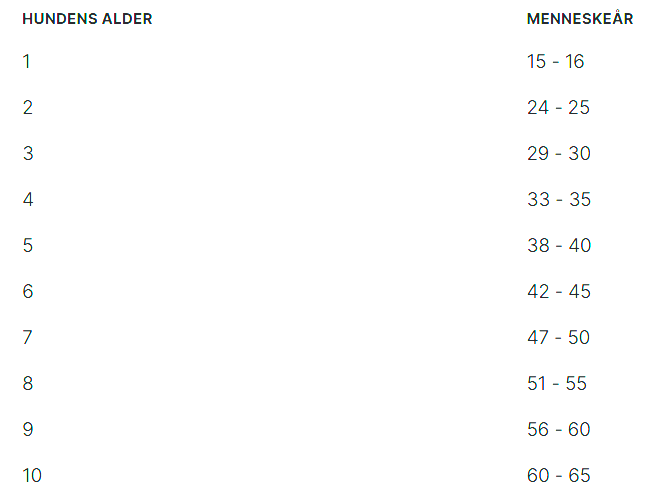 En 1 år gammel hund omtrent 15 menneskeår, mens en 3 år gammel hund svarer til omtrent 30 menneskeår, og en 10-åring tilsvarer nærmere 65 menneskeår.