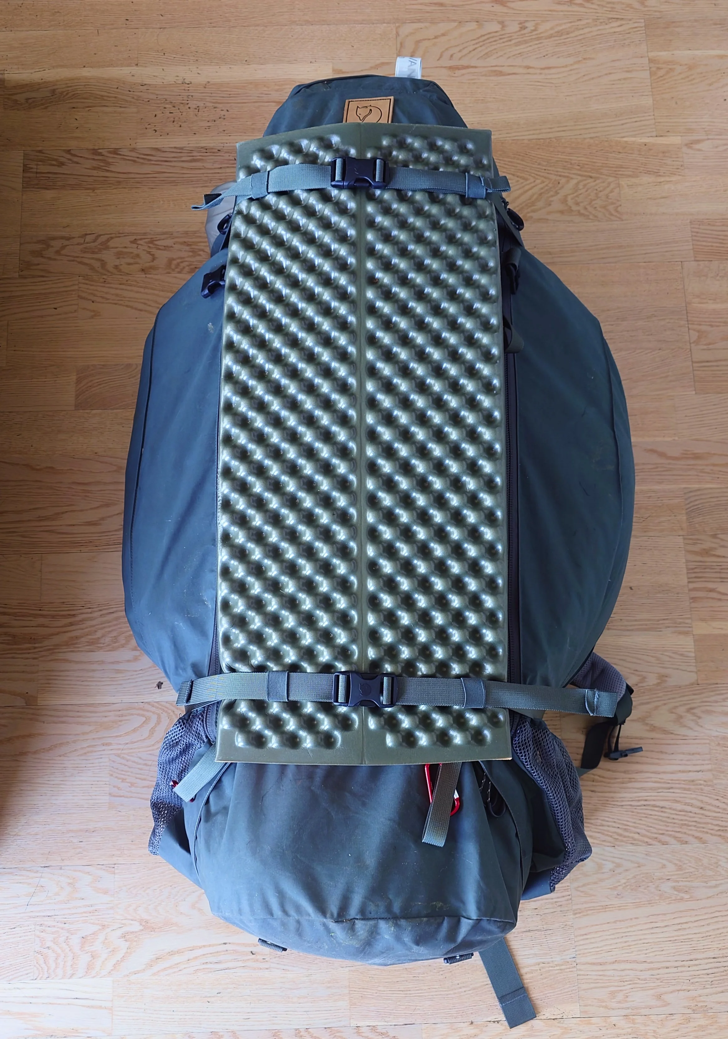 Jeg har nå et “trekkspill” liggeunderlag med eggekartongstruktur. Dette henger alltid på utsiden av sekken og brukes på samme måte som jeg gjorde med det gamle Bamse-underlaget når jeg er på teltturer. Denne løsningen har jeg valgt for kunne hatt et underlag til å ligge på på utsiden av teltet uten å være redd for at det går hull på det, og for å øke R-verdi og ligge komfort i teltet. Pluss at det oppblåsbare liggeunderlaget fra Exped da får en ekstra beskyttelse mot punktering.