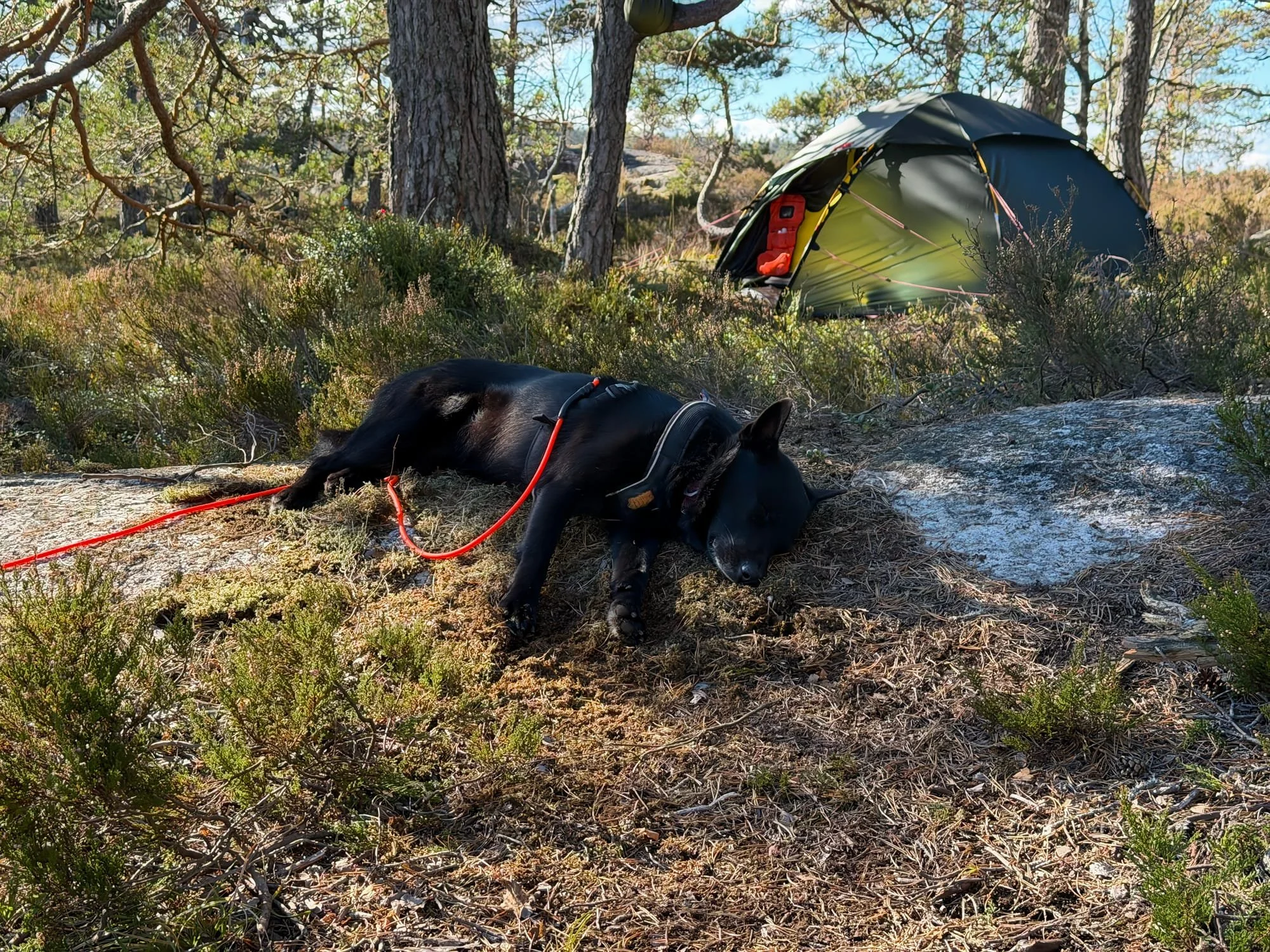I halvsju-tiden eller der omkring så ble det svare leven uten like utenfor teltduken, en skulle tro en våknet opp midt i en orreleik. Det var full krangel, kjefting og delvis slåssing mellom flere fugler. King Kenny er alltid godt tjoret fast i selve teltet og i pluggen ved inngangen på han sin side, vi har hver vår side i denne typen telt. Plutselig så greide han ikke å holde seg lenger, spenningen ble for stor og han og tok ut på skogsfugl jakt, det røkka noe vilt i teltet da linen tok slutt og den godeste Kenny fikk seg en uventet bråstopp. De fleste av fuglene forsvant med det samme han viste seg, men to av dem ble sittende igjen å kjekle en stund til, godt utenfor rekkevidden til Kenny. Jeg viste meg ikke og laget ikke lyd, da hadde jo alle forsvunnet med det samme, men det var en fin opplevelse å ligge i teltet å høre på, å se de for seg rett og slett.
