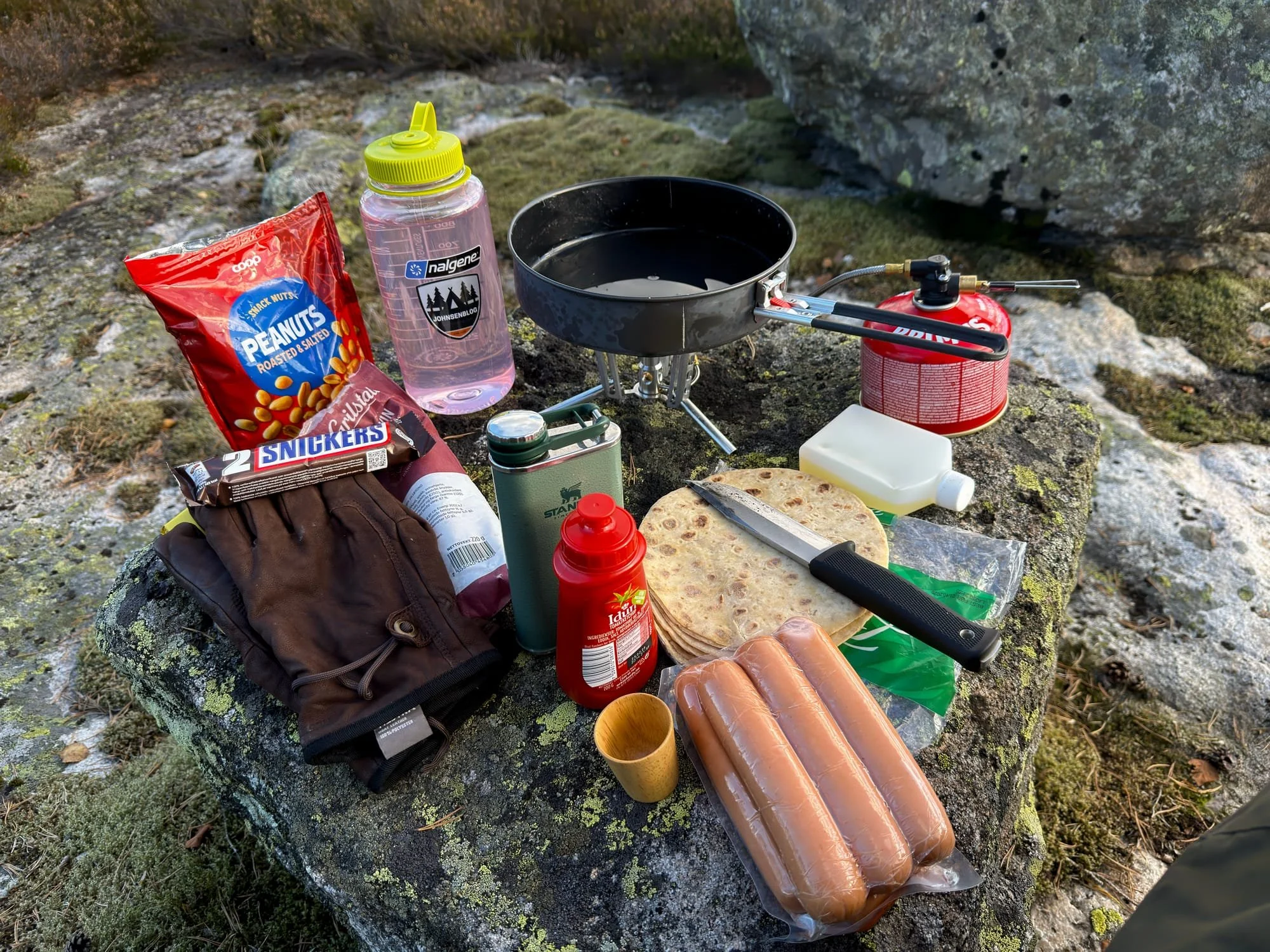 Dagens middag ble Gilde Ostepølse i lompe, det er 6 pølser i pakken, det er jo litt i overkant, så også denne gangen ble det delt broderlig. Jeg pleier ikke å ha fersk mat to dager på rad på tur, men siden det var meldt 4 °C på nettene og maks 10-12 °C på dagen, så tenkte jeg at det ville gå bra, og det gjorde det. Etter all maten, 2 halvlitere og et glass rødvin (det var alt som var igjen), så ble jeg så segen at jeg rett og slett tok en tidlig kveld. I åtte halv nitiden så satte jeg mobilen i flymodus og gikk å la meg i teltet for å lese, det ble ikke så mye lesing før jeg kveldet og sovnet som en stein.