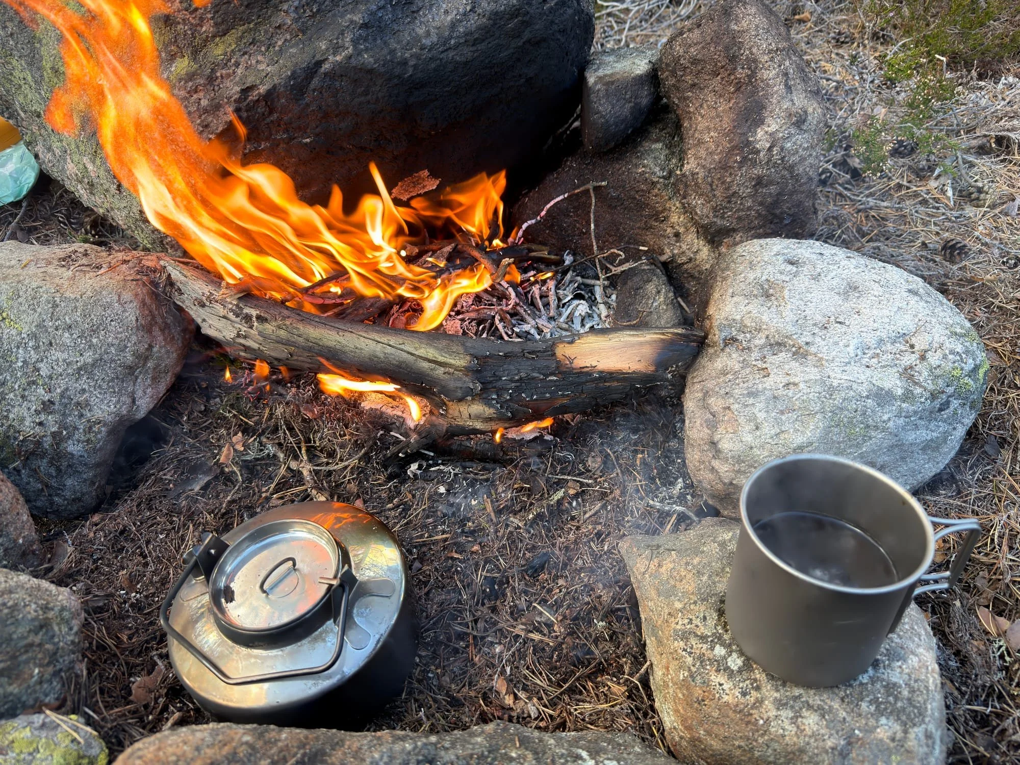Sent på ettermiddagen ble det nesten helt vindstille, men solen var stort sett bak noen skyer resten av dagen. Jeg tok sjansen på å båle litt igjen, og det er ganske utrolig hvor mye kos og varme det kan være i et bål, selv i et veldig lite et. Nå fikk kaffekjelen kjørt seg noen timer på bålet, skikkelig kos.