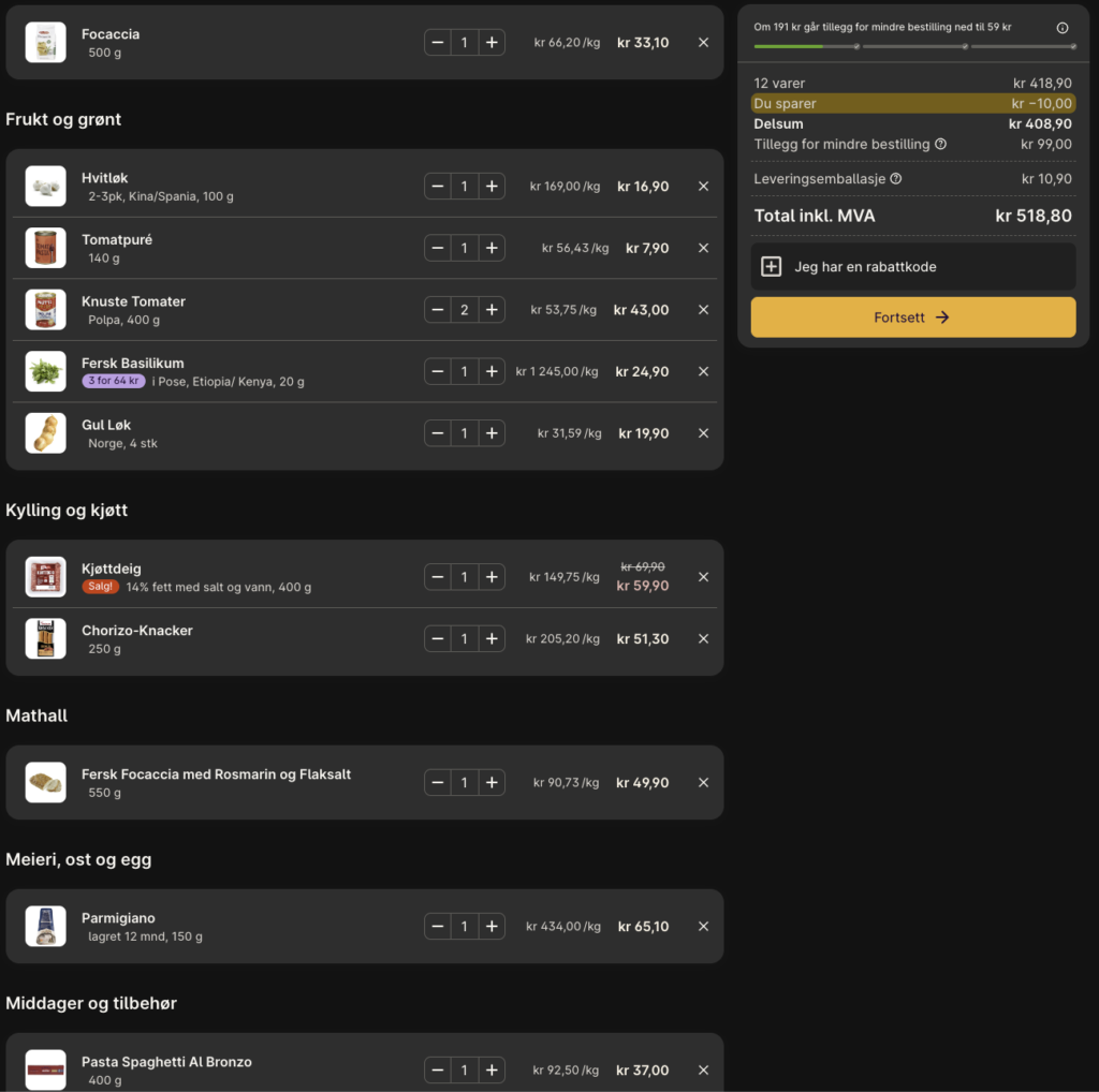 Jeg har nå lagt alle ingrediensene jeg ikke har i skapet fra før i handlekurven min på Oda der jeg handler 4-5 ganger i året. Jeg har lagt til både melblanding til å lage focaccia og et ferdigbakt. Som regel baker jeg dette selv, men jeg må nesten se hvordan neste uke utvikler seg. Blir det dårlig med tid, så lar jeg det ferdige bakte ligge i kurven. De er gode de også, men de blir veldig fort veldig tørre.